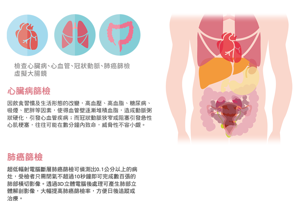 建議部位: 頭頸部腫瘤檢查、心臟冠狀動脈檢查、肺部腫瘤檢查、胸、腹部腫瘤檢查、血管鈣化分析等。 |