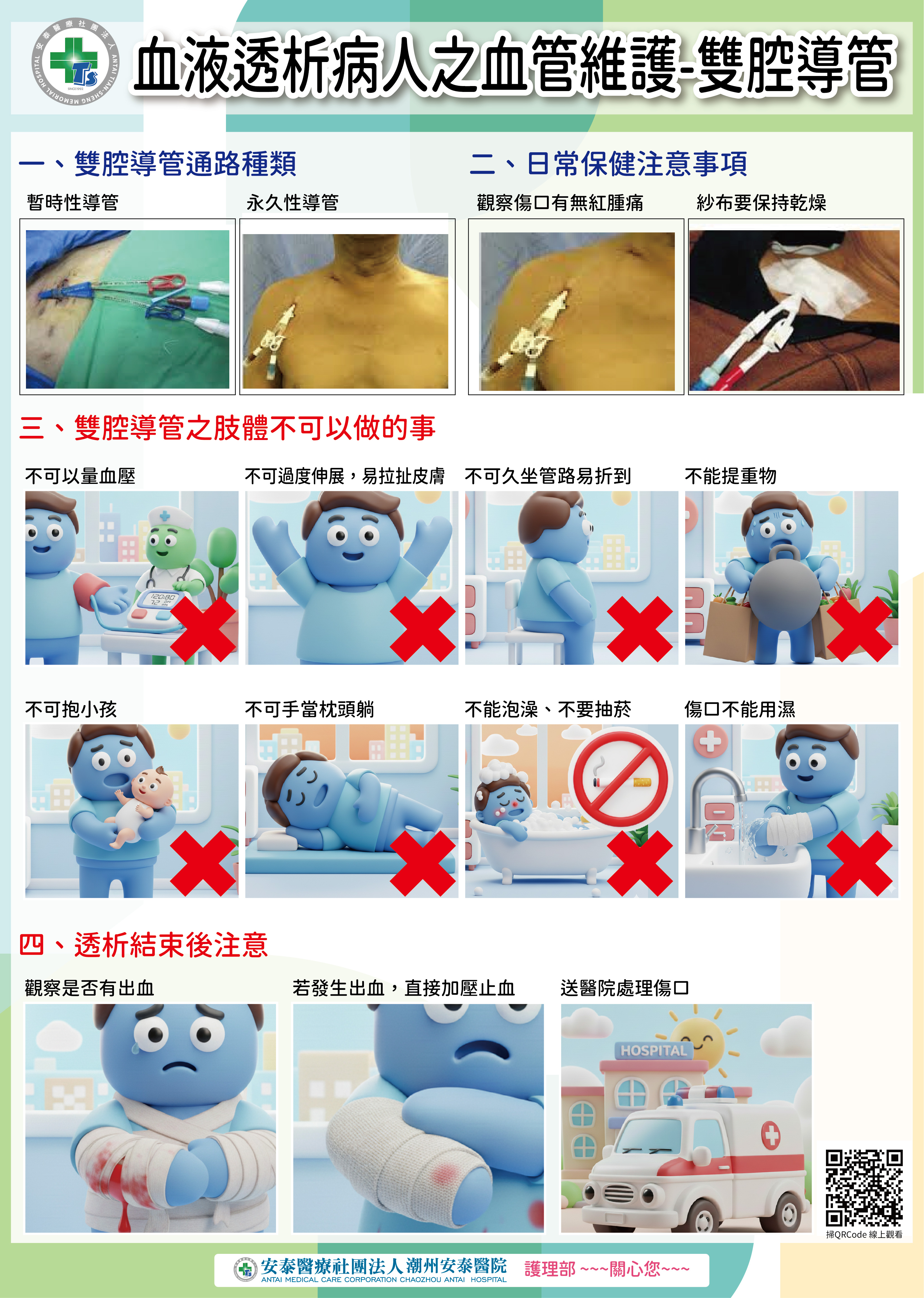 血液透析病人之血管維護-雙腔導管 衛教|..|.. 瀏覽:2025/11/14-13:56:04 公告:2025/11/06-12:19:05 資料來源:潮州安泰醫院│護理部 血液透析病人之血管維護-雙腔導管 檔案下載: 手機下載本訊息 用LINE分享 訊息: