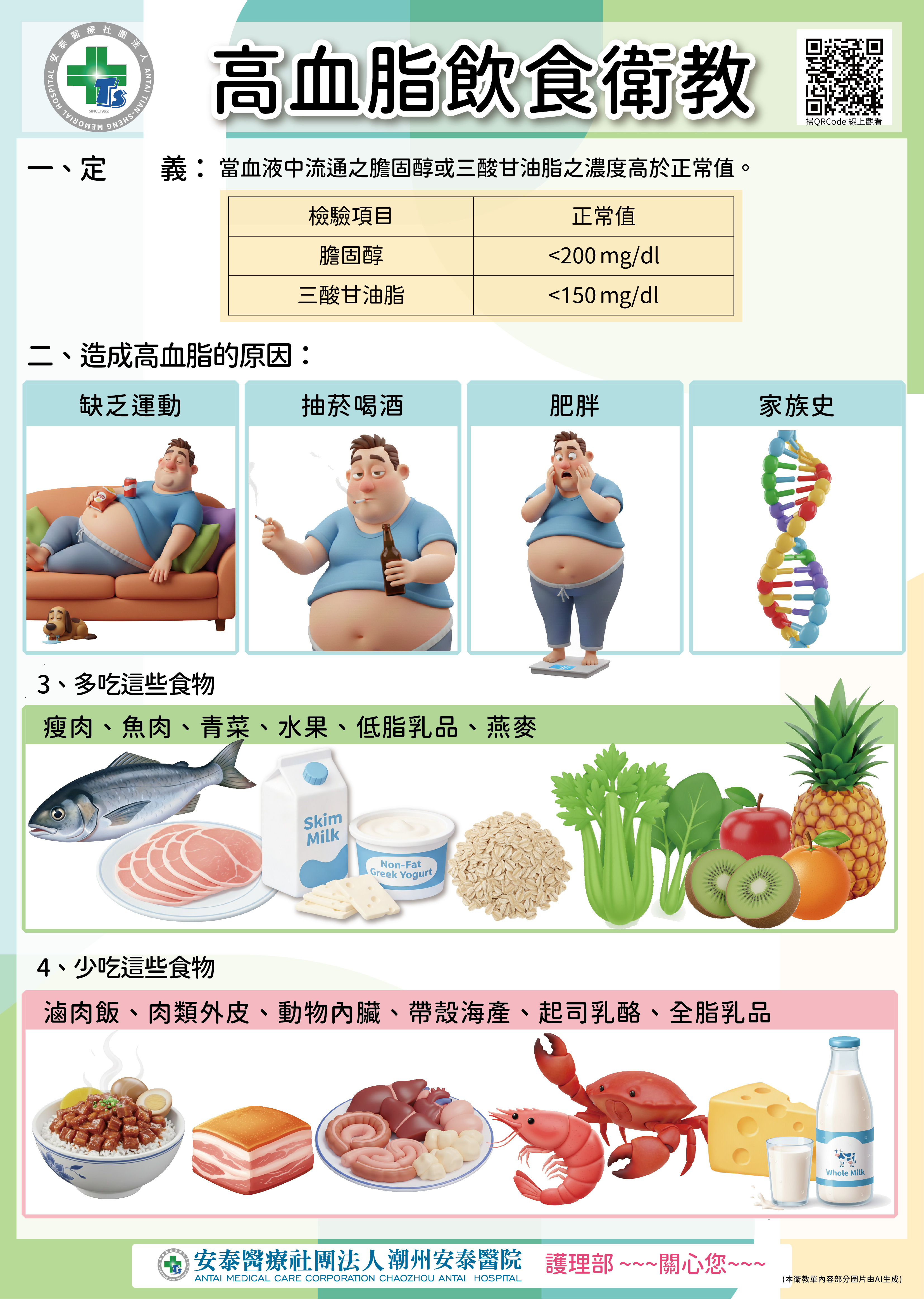 營養│高血脂飲食衛教 衛教|..|.. 瀏覽:2025/12/16-03:31:20 公告:2025/12/04-15:32:42 資料來源:潮州安泰醫院│護理部 營養-高血脂飲食衛教 . 手機下載本訊息 用LINE分享 訊息: