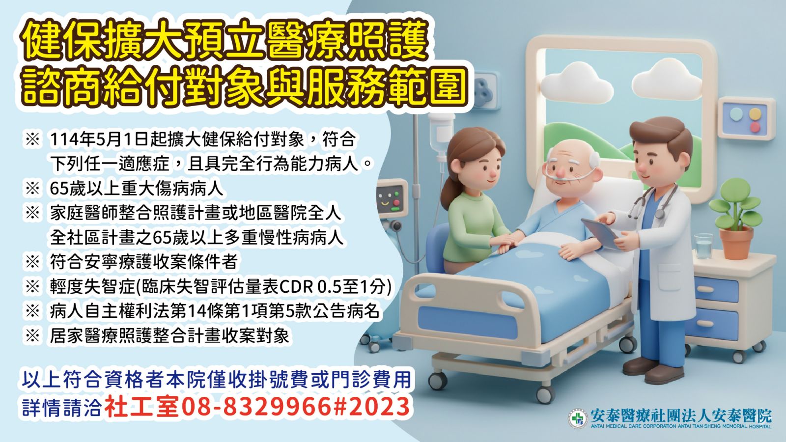 - 健保擴大預立醫療照護諮商給付對象與服務範圍