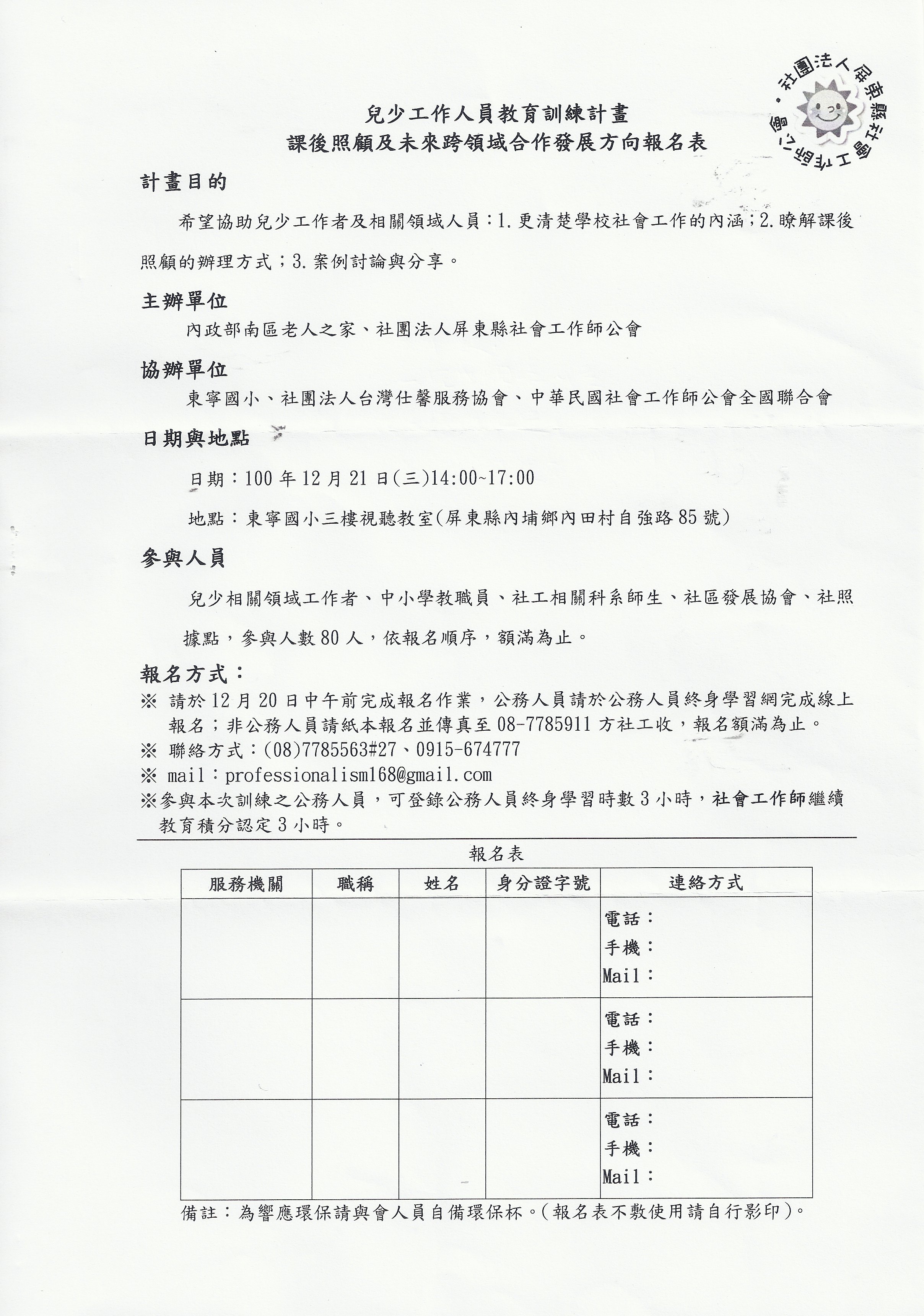 兒少工作人員教育訓練計劃---課後照護及未來跨領域合作發展方向 公告|院外課程|教研部 瀏覽:2025/11/14-12:52:21 公告:2011/12/21-05:33:58 全頁朗讀 |停止朗讀 | 一、辦理目的: 協助兒少工作者及相關領域人員:1. 更清楚學校社會工作的內涵。 2. 瞭解課後照護的辦理方式。 3. 透過案例討論與分享,跨領域的專業人員彼此交流經驗分享,增廣見聞的機會。 二、研習日期:100年12月21日(三)14:00~17:00 三、研習地點:東寧國小三樓視聽教室(屏東縣內埔鄉內田村自強路85號) 檔案下載: 手機下載本訊息 用LINE分享 訊息: