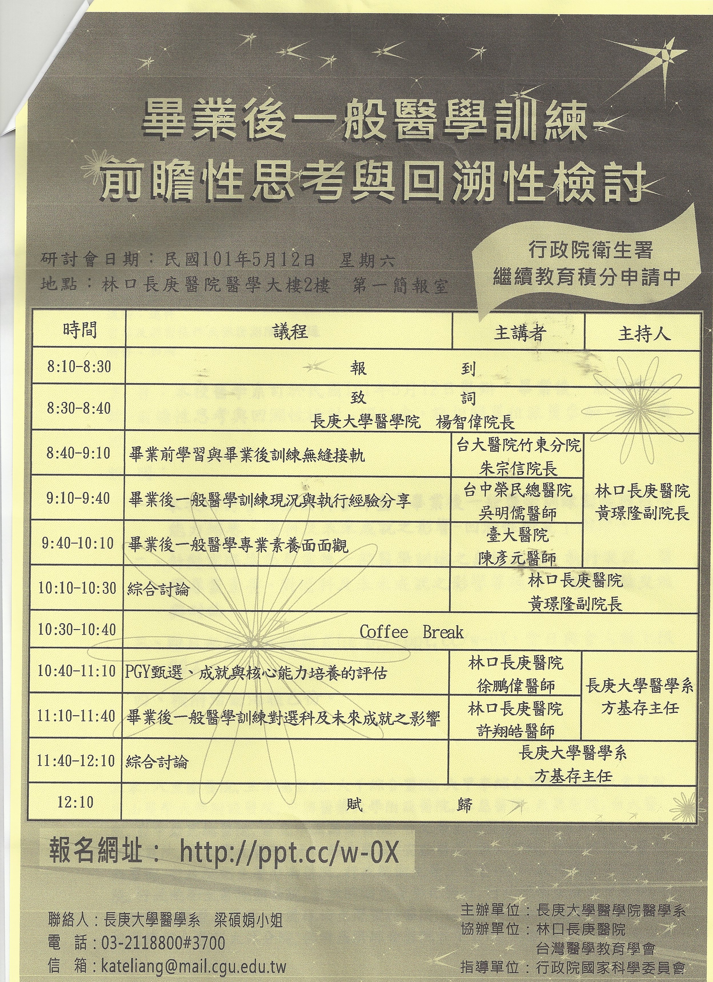 林口長庚醫院5月12日舉辦:畢業後一般醫學訓練檢討會 公告|院外課程|教研部 瀏覽:2025/11/13-17:12:06 公告:2012/04/06-06:14:42 全頁朗讀 |停止朗讀 | 課程名稱:畢業後一般醫學訓練-前瞻性思考與回溯性檢討 上課地點:林口長庚醫院醫學大樓2樓第一簡報室 上課時間:5月12日8:10~12:10 報名網址:http://ppt.cc/w-0X 聯絡人員:梁碩娟小姐03-2118800分機3700 檔案下載: 手機下載本訊息 用LINE分享 訊息: