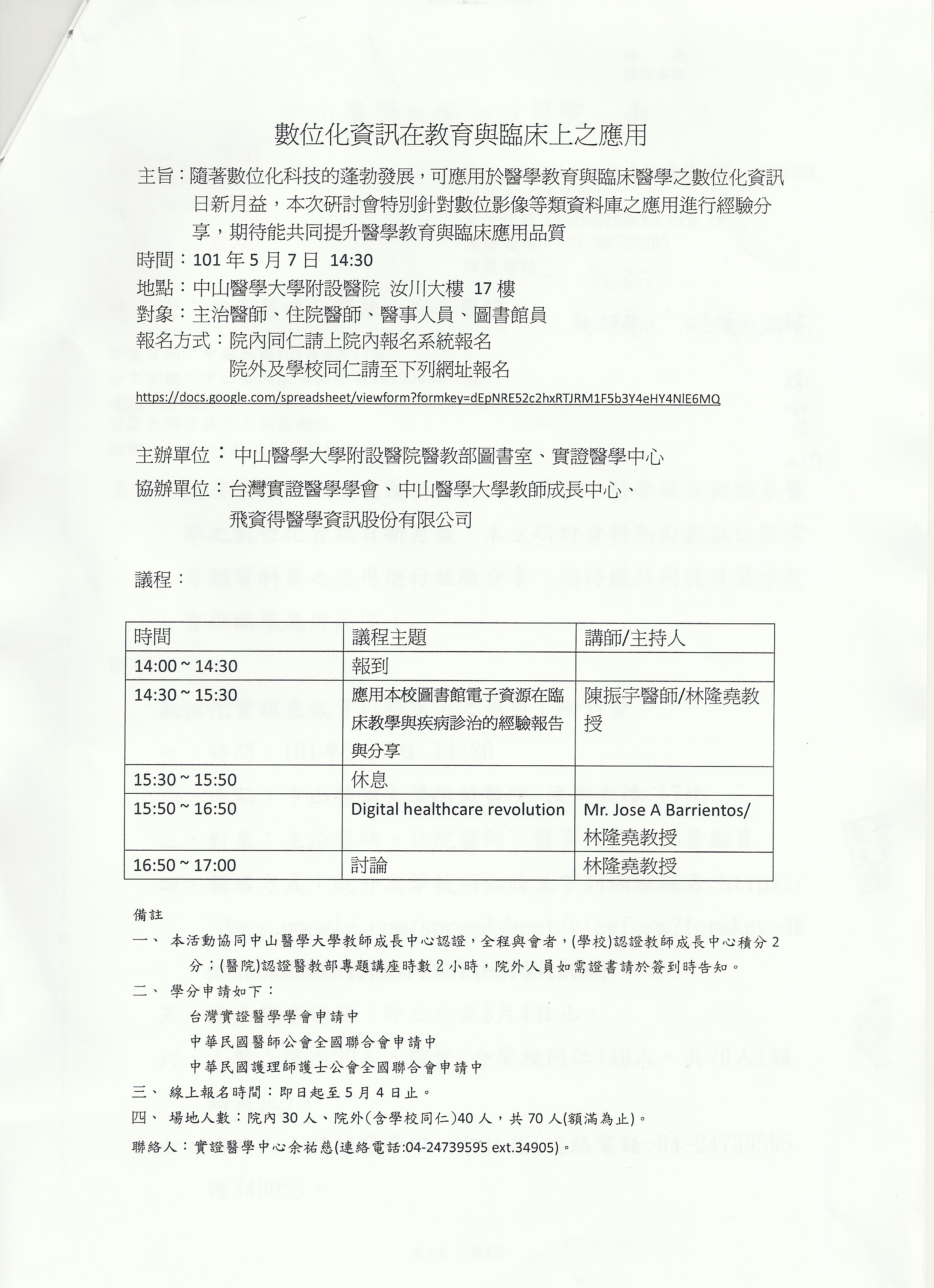 中山醫學大學5月7日舉辦數位化資訊在教育與臨床應用 公告|院外課程|教研部 瀏覽:2025/11/13-15:55:10 公告:2012/04/17-07:49:58 全頁朗讀 |停止朗讀 | 一 時間:101年5月7日 14:30 二 地點:中山醫學大學附設醫院 汝川大樓 17樓 三 報名方式:網路報名 四 聯絡人:實証醫學中心 余佑慈(聯絡電話:04-24739595轉34905) 檔案下載: 手機下載本訊息 用LINE分享 訊息: