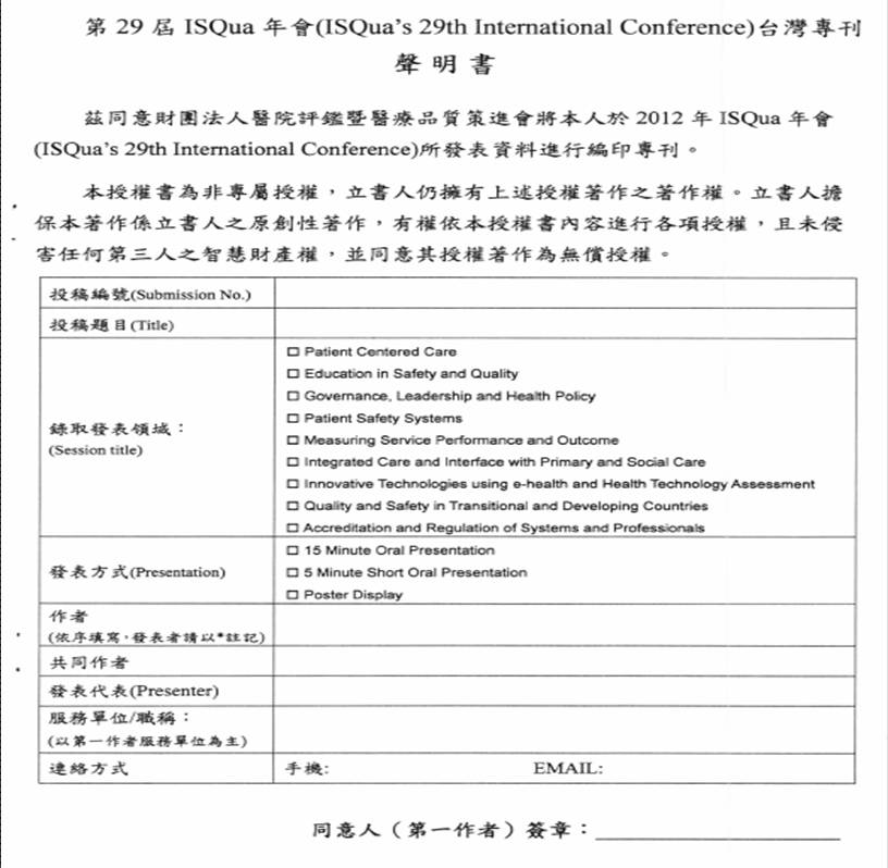 三.財團法人醫院評鑑暨醫療品質策進會將收集台灣代表即將於2012年ISQua國際年會發表學術論文摘要,進行編印台灣代表特刊.