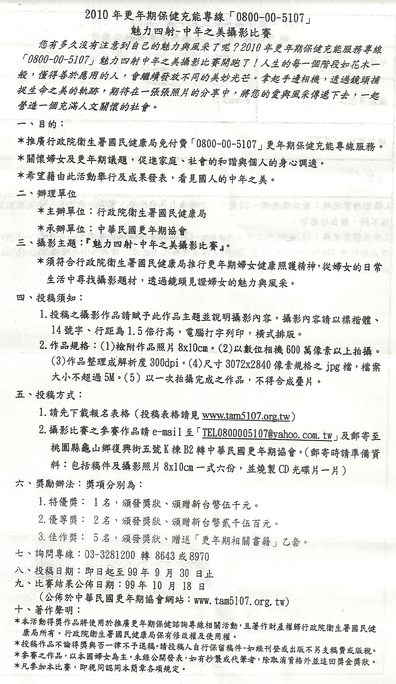更年期保健諮詢專線攝影比賽 公告|院外課程|教研部 瀏覽:2026/02/22-05:59:35 公告:2010/07/27-04:15:46 全頁朗讀 |停止朗讀 | 更年期保健諮詢專線攝影比賽 詳細參賽內容見附件,歡迎踴躍參加 檔案下載: 手機下載本訊息 用LINE分享 訊息:
