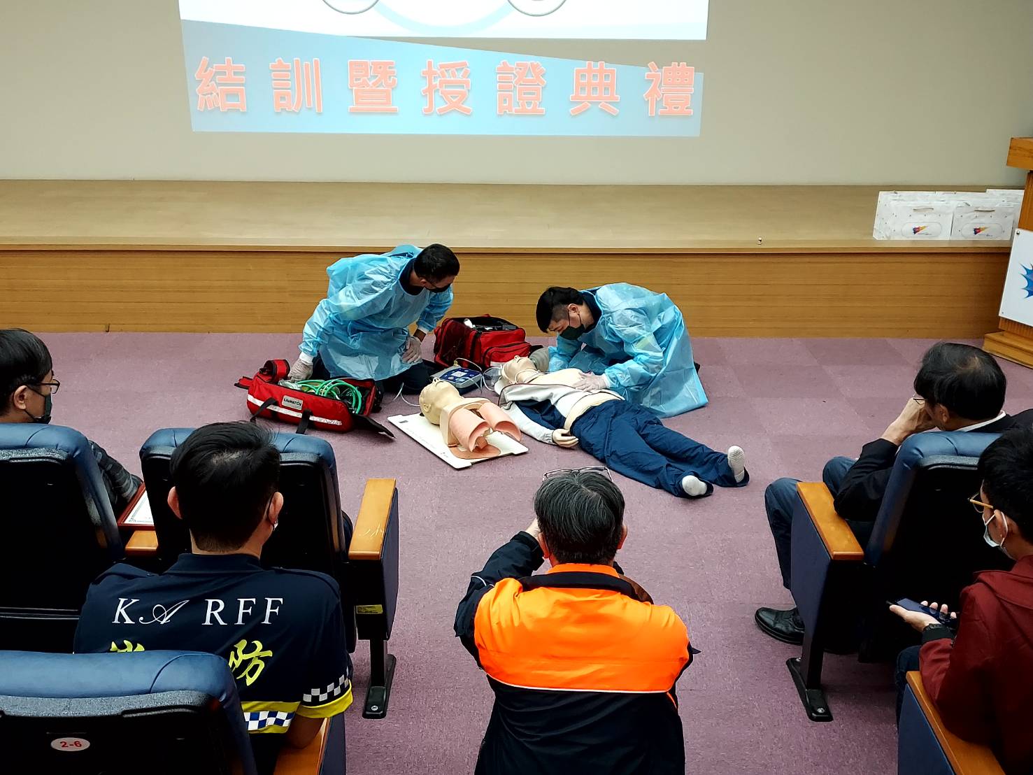 委由全台唯一設置「到院前救護中心」專責辦理緊急救護訓練且獲頒國家品質標章認證的東港安泰醫院(重度級急救責任醫院)主辦,結合大仁科技大學消防安全學士學位學程、高雄市立小港醫院共同辦理為期36天共計280小時的訓練,並在今日舉行結訓典禮。 今天的結訓典禮既有高雄國際航空站傅耀南主任、孫翼中副主任、航務組李聰文組長、消防隊李建榮隊長,東港安泰醫院蘇清泉榮譽院長、急診醫學科盧毓宏主任、管理部胡志偉組長,大仁科技大學消防安全學士學位學程葉琮勤副主任,高雄市立小港醫院黃鵬如副院長、急診科護理長楊純怡,屏東榮民總醫院急重症醫學部周上琳醫師等前往參加。