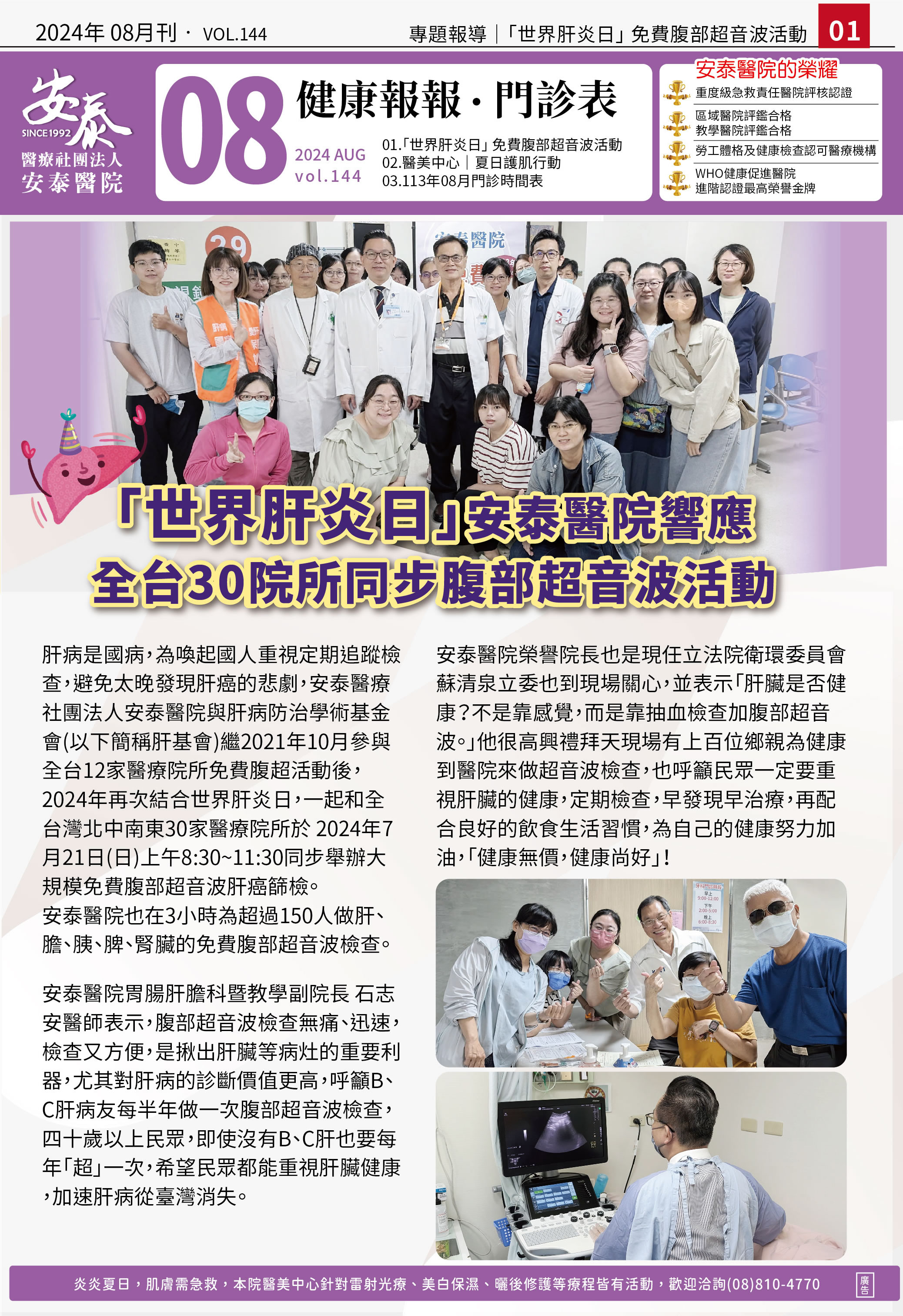 安泰健康報報│113年08月 世界肝炎日 安泰醫院響應全台30院所同步免費腹部超音波活動 衛教|健康報報|資訊美編組 瀏覽:2025/12/14-19:06:21 公告:2024/07/31-18:14:50 全頁朗讀 |停止朗讀 | 安泰健康報報 本刊物以介紹醫療保健資訊為主,每月出刊一次,民眾可至安泰醫院服務台索取,或於本站下載電子版。 ※請點選圖片看大圖 醫療巡迴時間表 . 手機下載本訊息 用LINE分享 訊息: