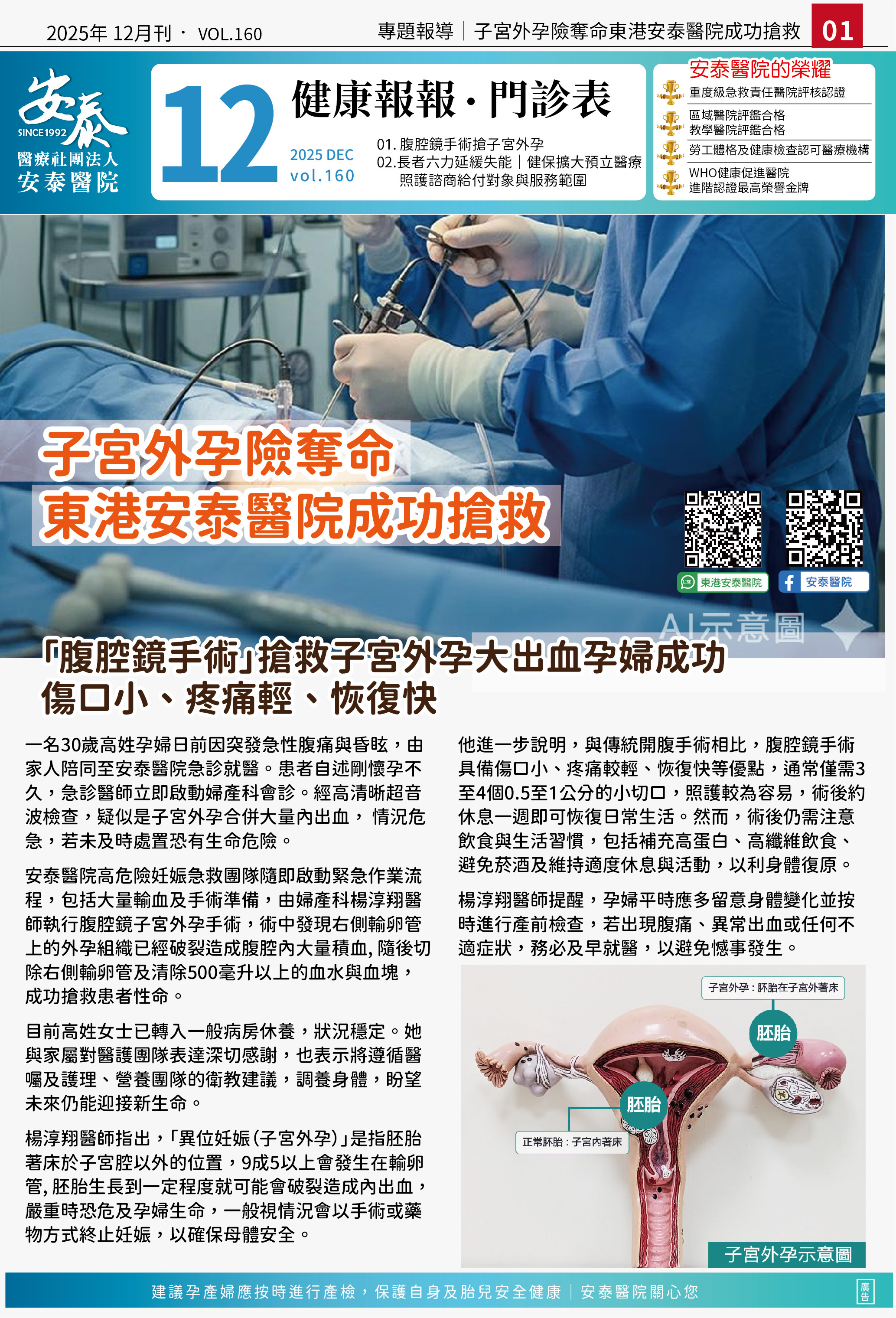 健康報報│114年12 子宮外孕險奪命 安泰醫院成功搶救 衛教|健康報報|資訊美編組 瀏覽:2025/12/03-19:37:12 公告:2025/11/28-15:33:34 全頁朗讀 |停止朗讀 | 安泰健康報報 本刊物以介紹醫療保健資訊為主,每月出刊一次,可於本站下載電子版。 ※請點選圖片看大圖 醫療巡迴時間表 . 手機下載本訊息 用LINE分享 訊息: