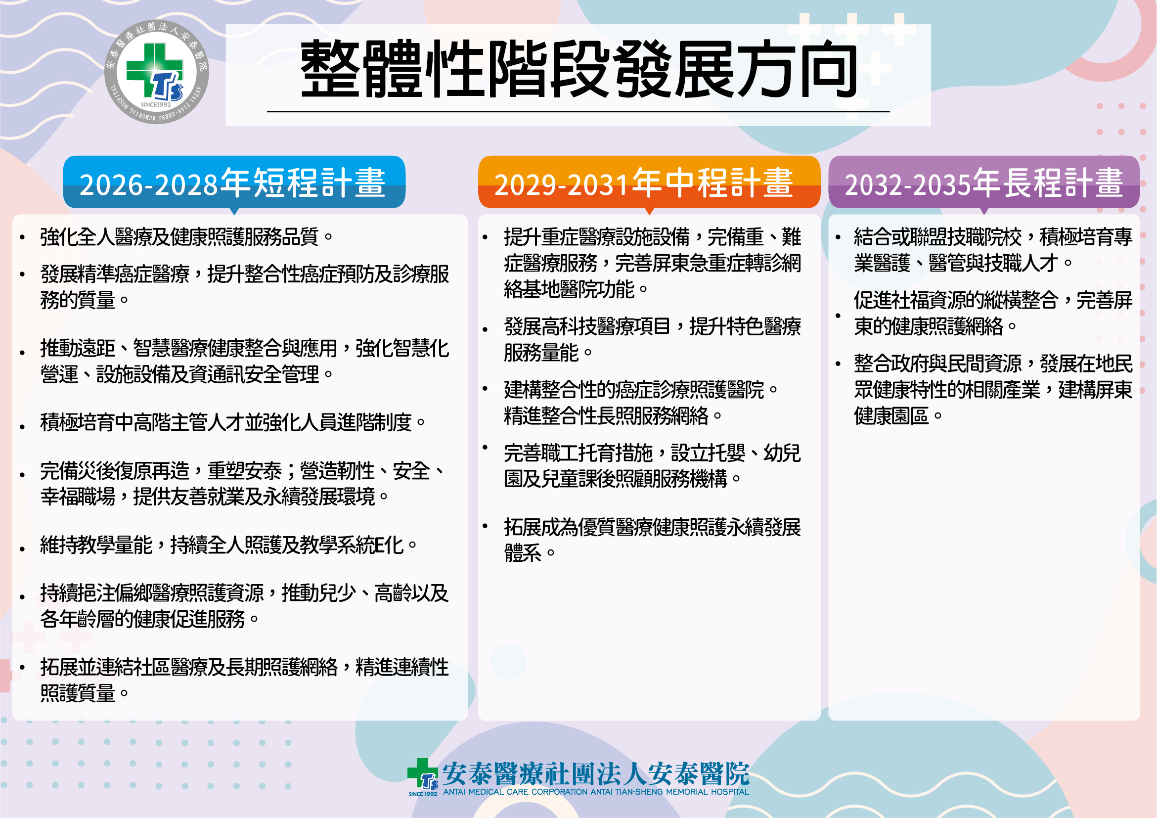 認識安泰│宗旨願景 2025/12/02 7:50:29 全頁朗讀 |停止朗讀 | 醫院簡史 │院長簡介 │ 副院長簡介 │ 宗旨願景 │ 組織架構 重大醫療設備 │ 獎狀 │ 認證 │ 感謝狀 │ 合作夥伴 發展計劃與方向 [點此可下載大圖]