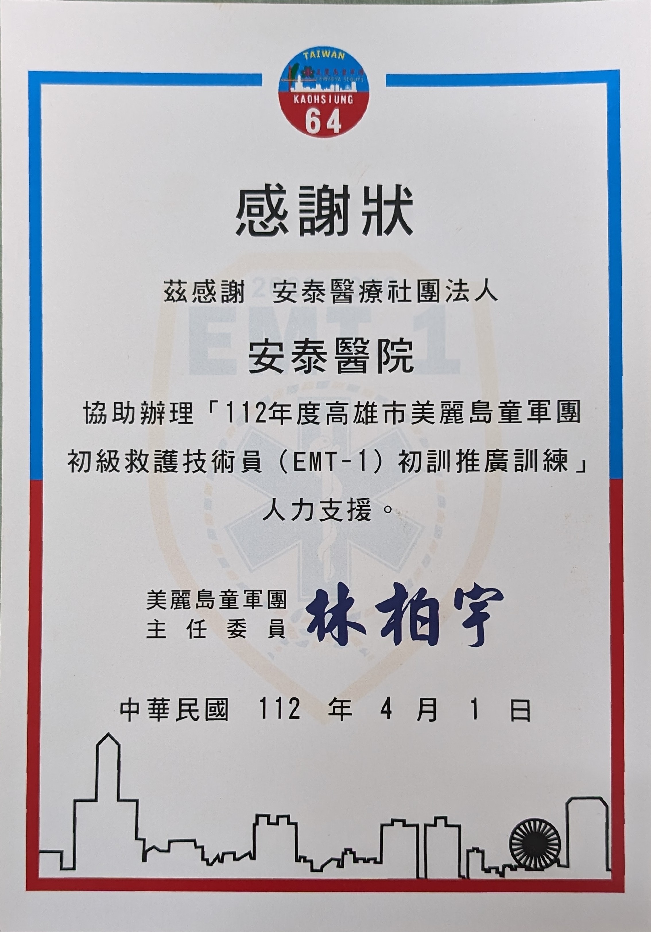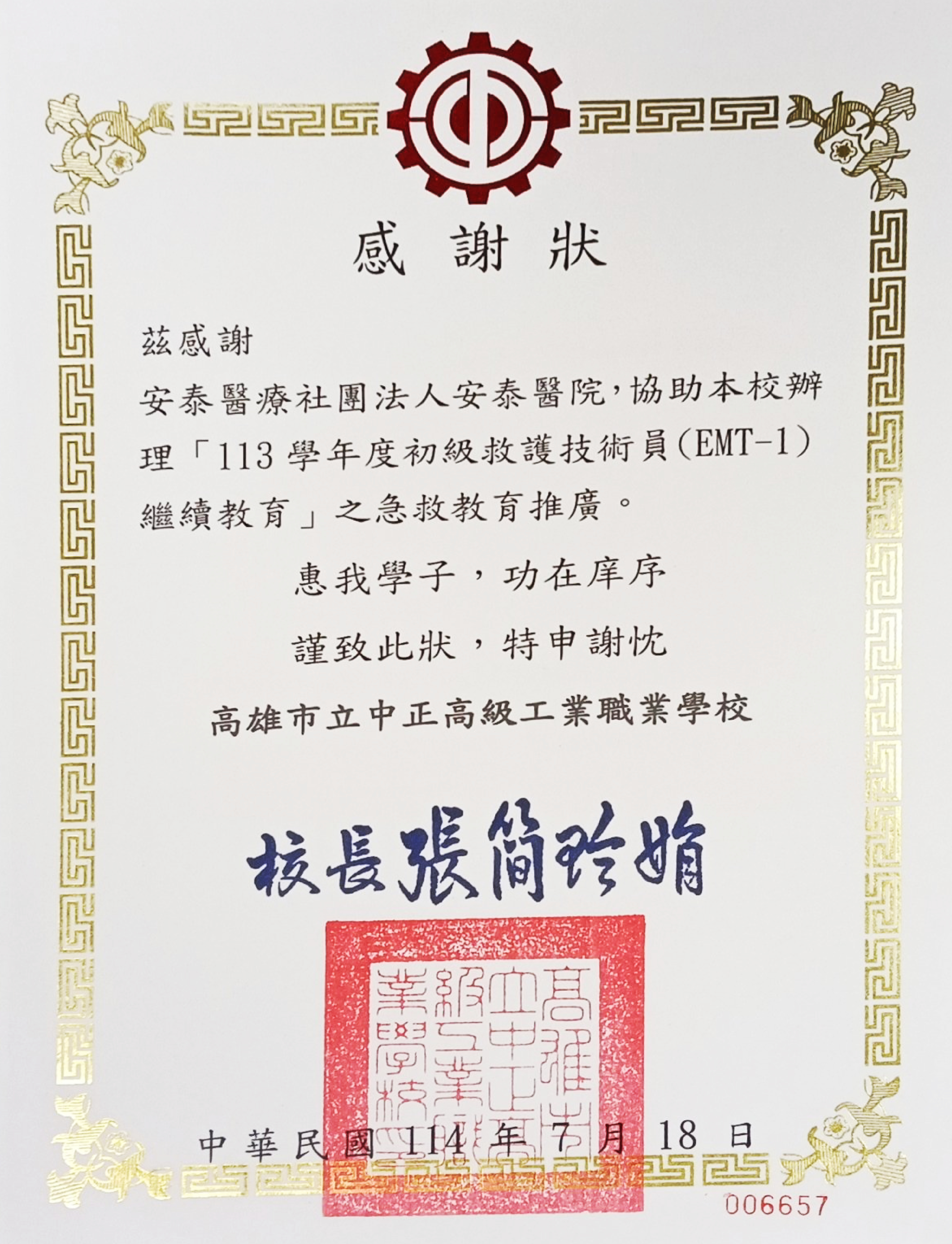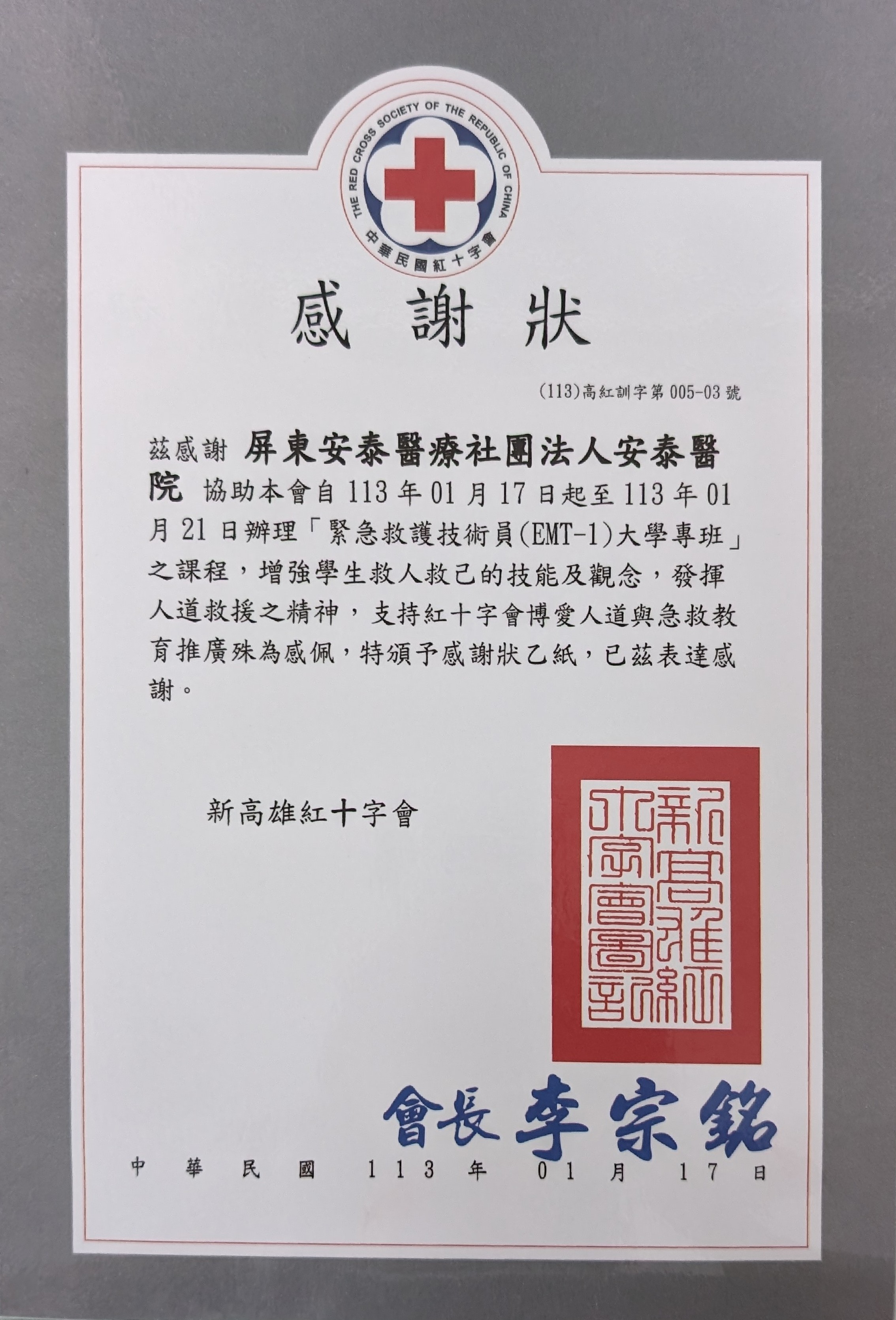 感謝安泰醫療社團法人安泰醫院鼎力協助辦理「113年度初級救護技術員(EMT-1)繼續教育課程」