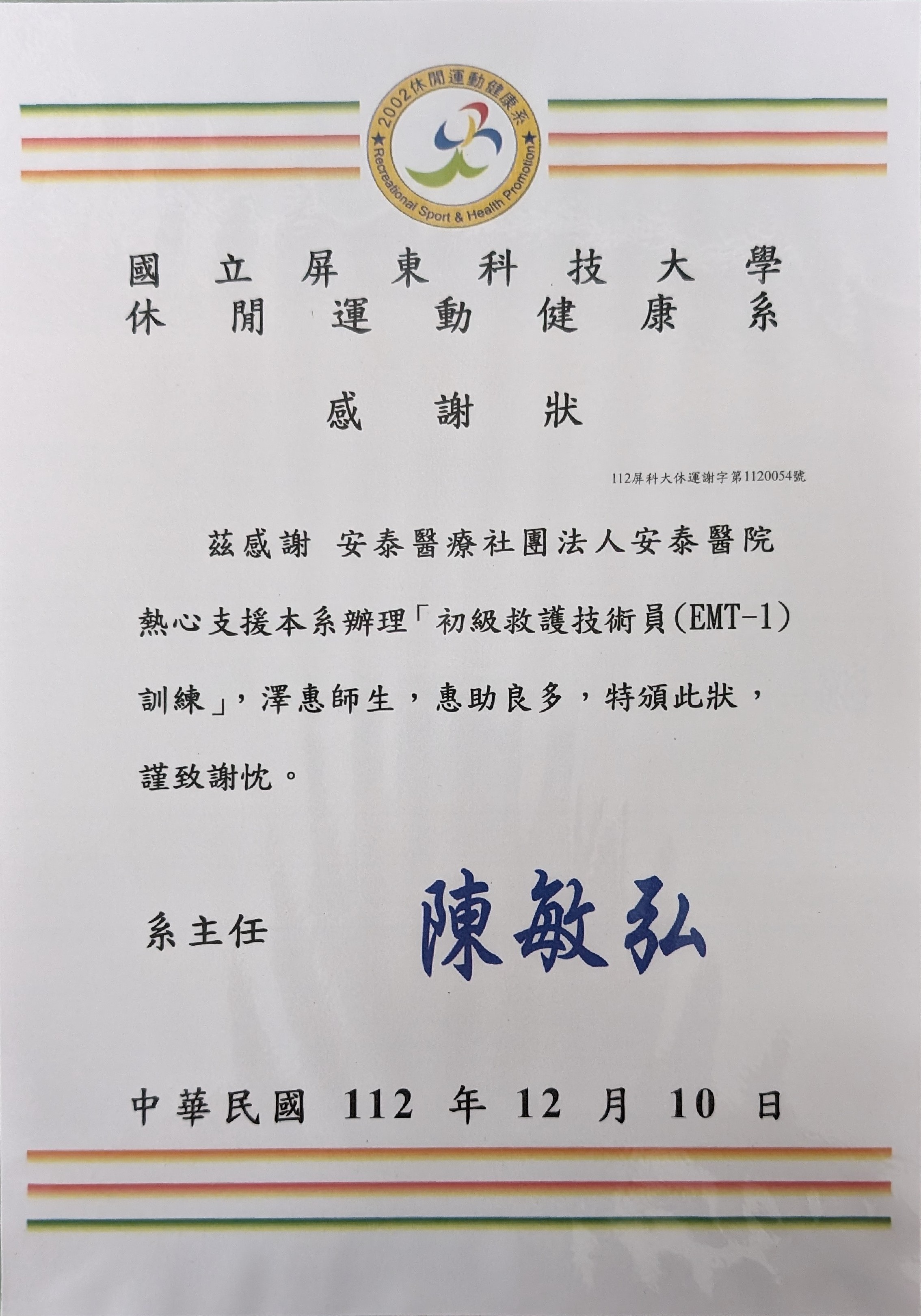 2020.11-感謝狀 茲感謝 國立屏東科技大學休閒運動健康系 |