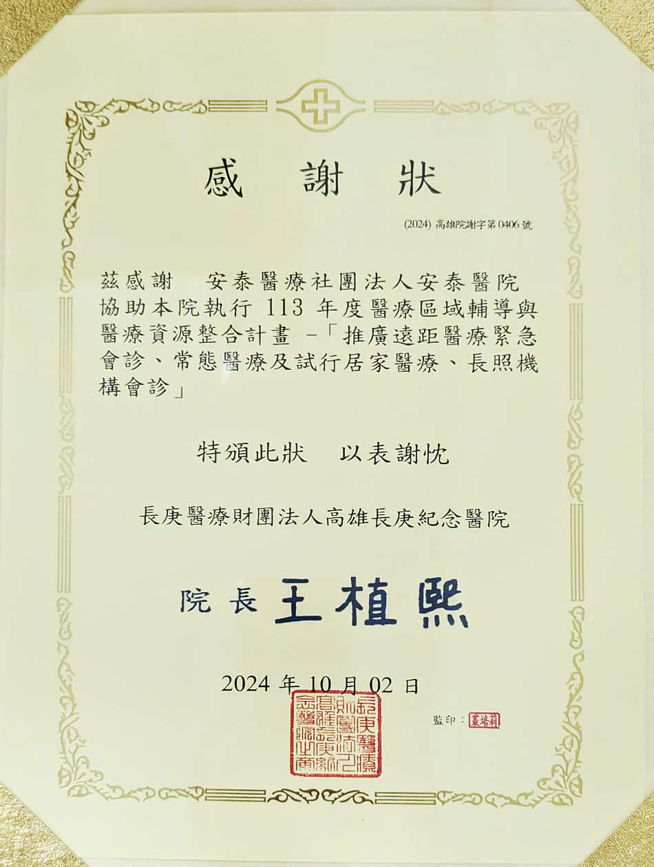 安泰醫療社團法人安泰醫院協助本院執行113年度醫療區域輔導與醫療資源整合計畫「推廣遠距醫療緊急會診、常庇醫療柔試行居家醫療、長照機構會診」