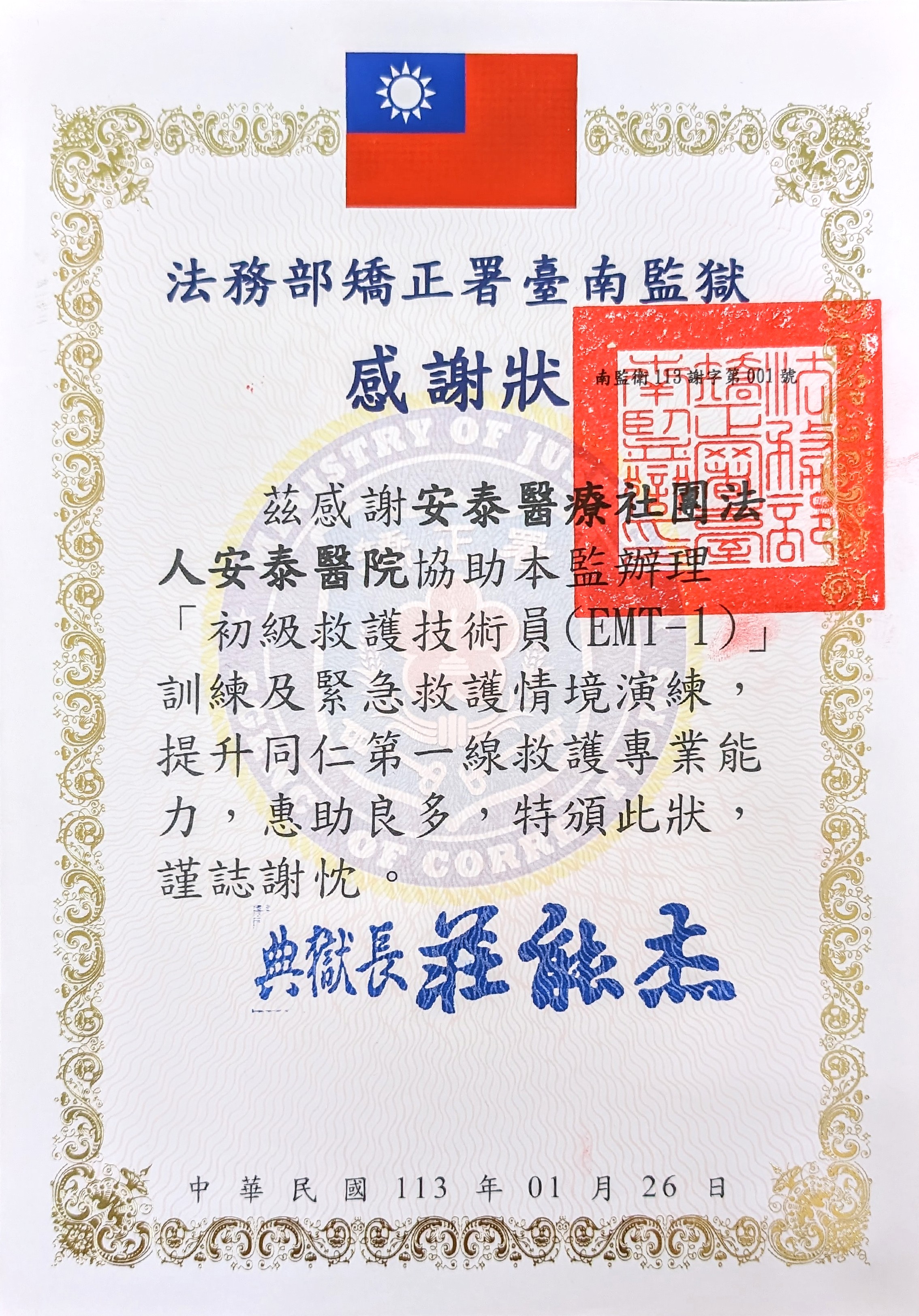 感謝安泰醫療社團法人安泰醫院鼎力協助本監辦理「初級救護技術員(EMT-1)訓練及救護情境演練」