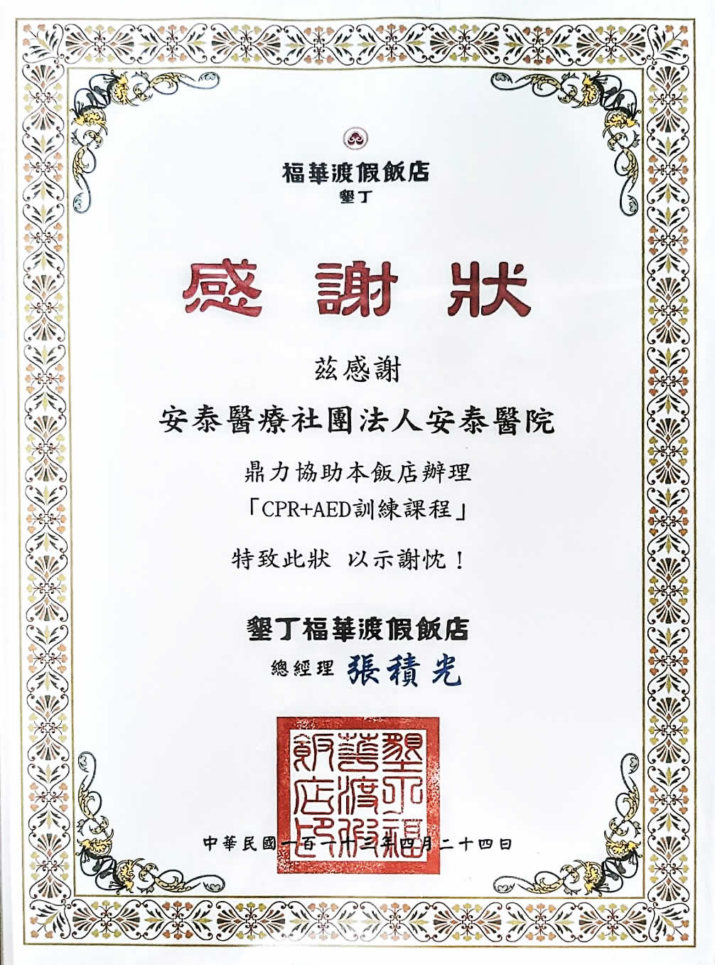 感謝安泰醫療社團法人安泰醫院鼎力協助本飯店辦理「CPR+AED訓練課程」