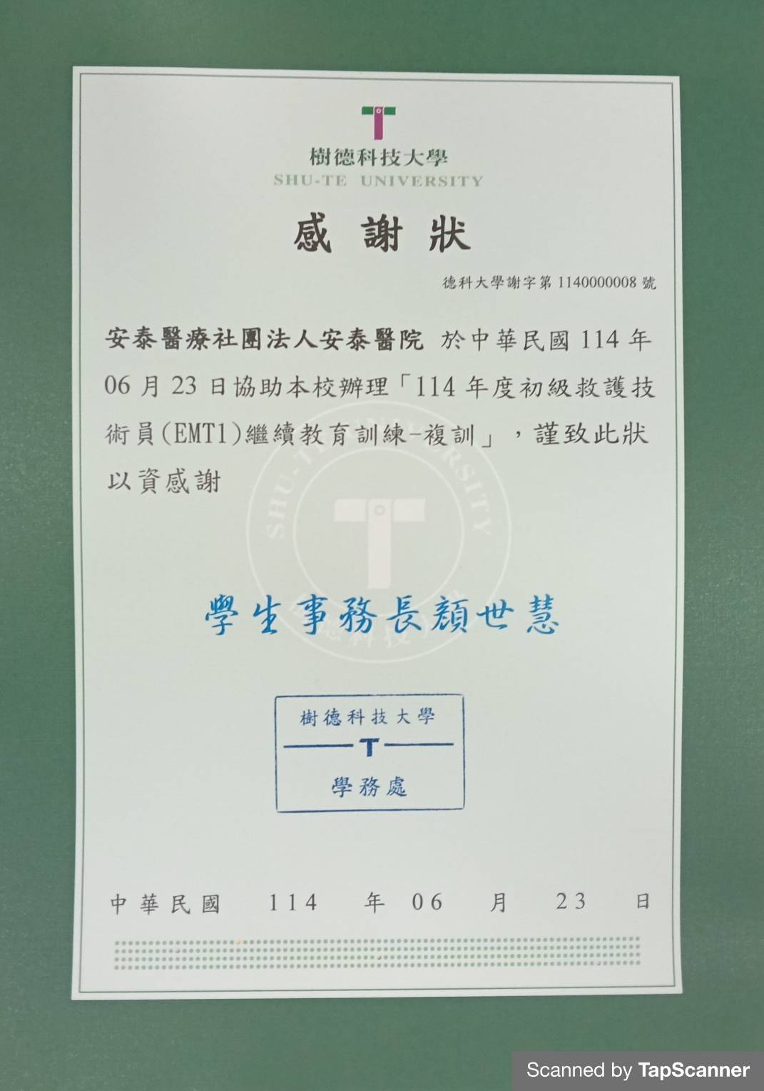 感謝安泰醫療社團法人安泰醫院鼎力協助辦理「114年度初級救護技術員(EMT-1)繼續教育課程-複訓」