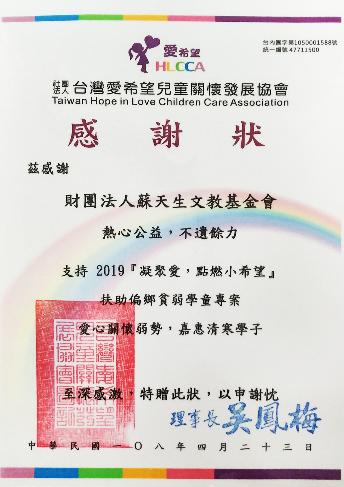 2019.04 財團法人台灣愛希望兒童關懷發展協會 感謝狀 茲感謝 |