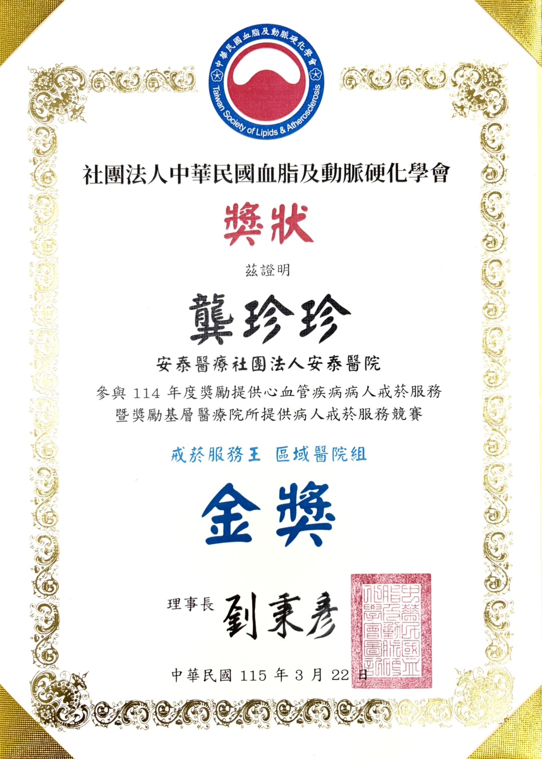 頒獎單位:社團法人中華民國血脂及動脈硬化學會
