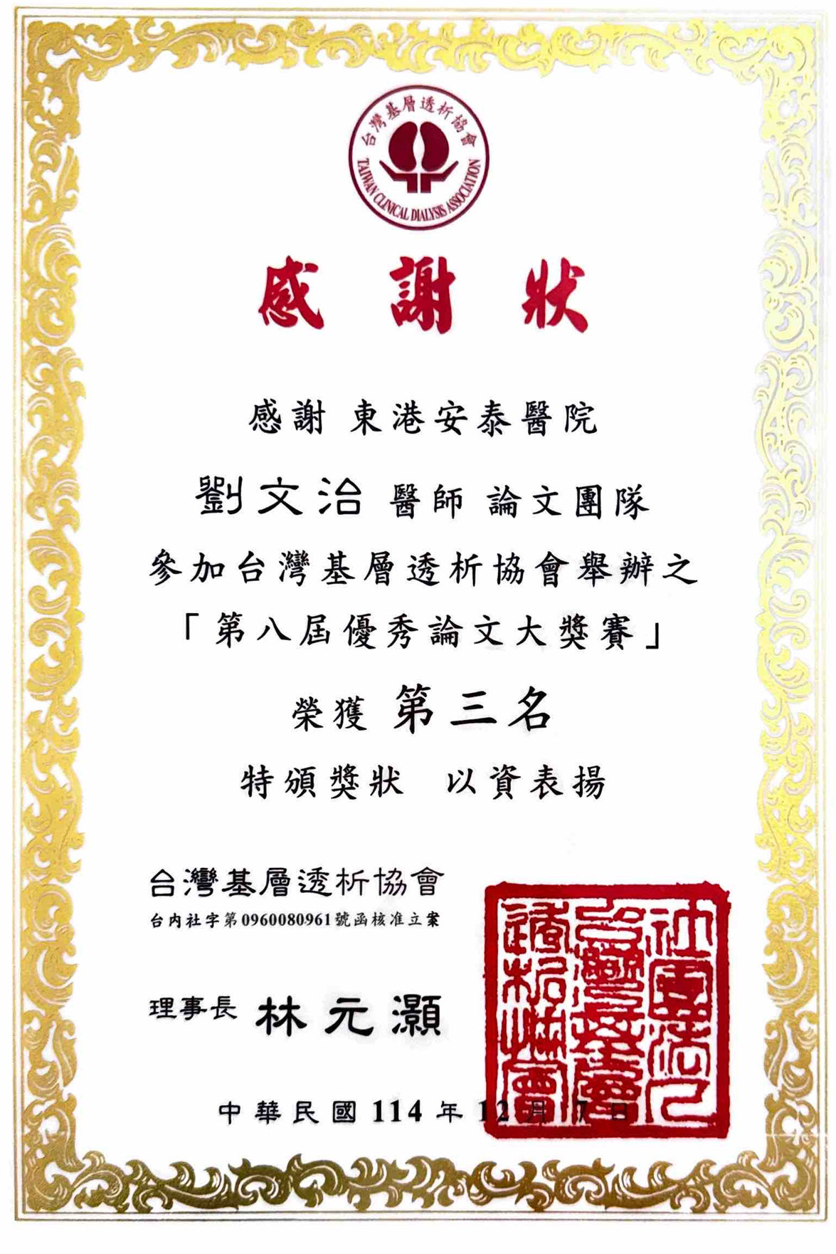 本院劉文治醫師論文團隊參加由台灣基層透析協會主辦的「第八屆優秀論文大獎賽」,在眾多參賽團隊中表現亮眼,最終榮獲第三名,獲得協會特頒獎狀以玆表揚。
